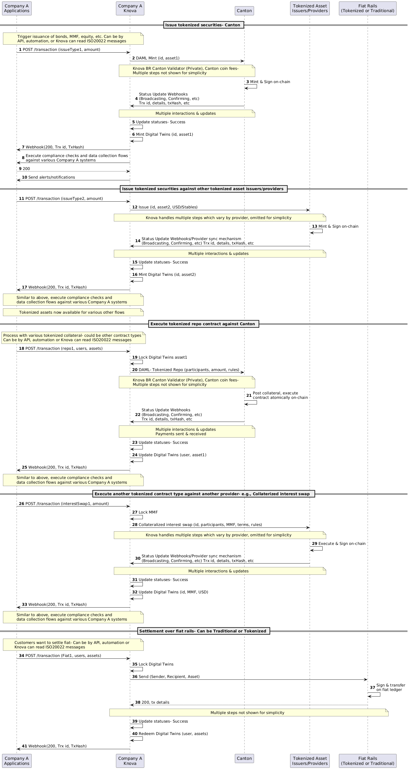 Example flow of how Company A may leverage various providers to support issuance of tokenized assets, use them as collateral, and allow customers to settle fiat. Canton is used as an example provider but various others can be supported as well:
